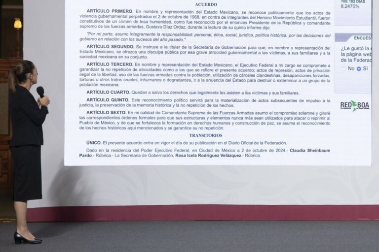 Desde Palacio Nacional, la mandataria recordó que hace un año se publicó en el Diario Oficial de la Federación el decreto donde se reconoce “políticamente que los actos de violencia gubernamental, perpetrados el 2 de octubre de 1968 en contra de integrantes del heroico movimiento estudiantil fueron constitutivos de un crimen de lesa humanidad, como fue reconocido por el entonces presidente de la República y comandante supremo de las Fuerzas Armadas, Gustavo Díaz Ordaz, durante la lectura de su quinto informe”.