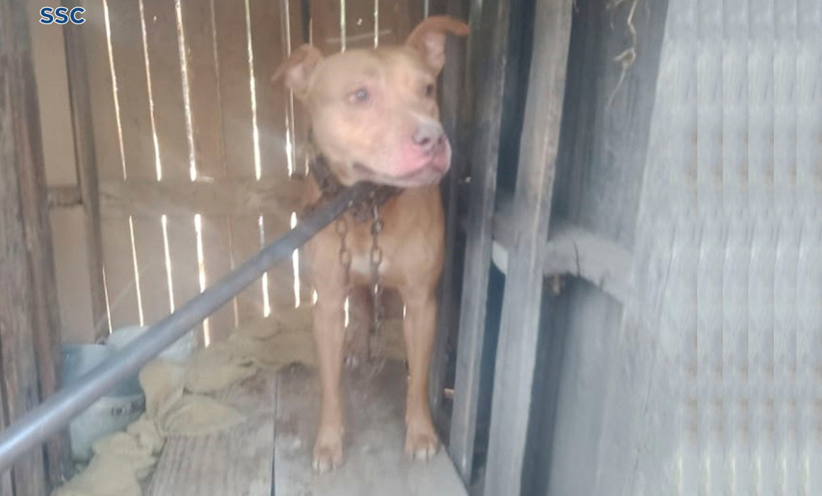Se trata de un perrito de la raza pitbull que se encontraba encerrado en una caja de madera, en un camellón del cruce de las calles Crisantemo y Almendros, reportaron los oficiales que acudieron al lugar a atender la denuncia de maltrato animal.