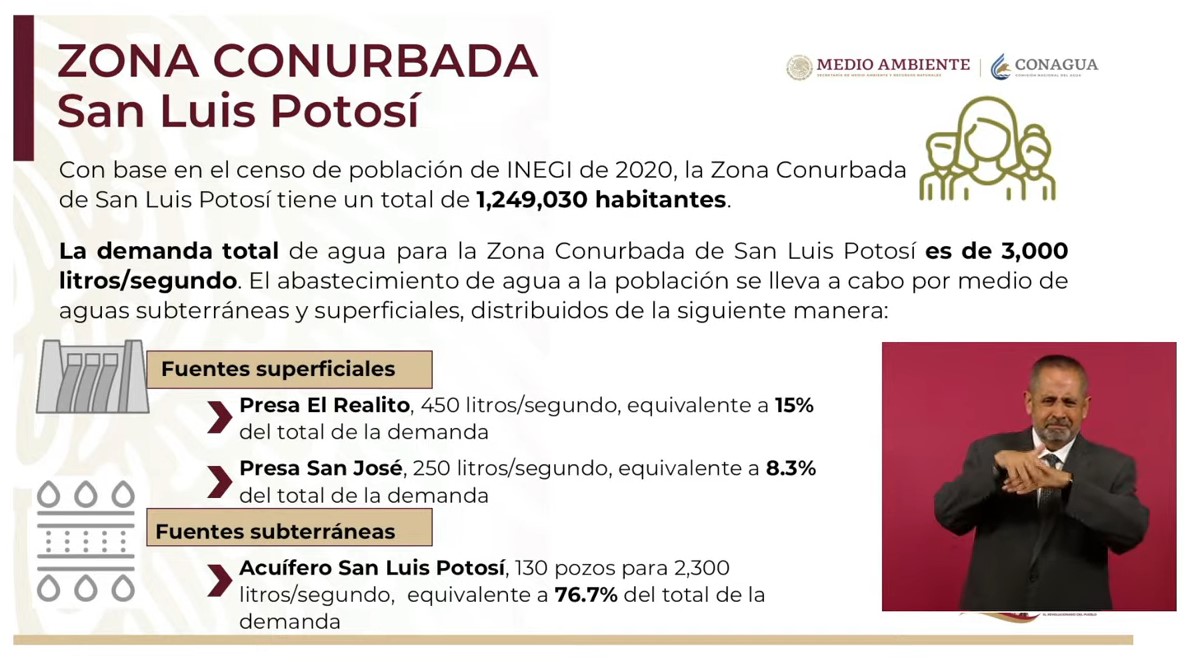 Martínez Santoyo dio a conocer que la demanda para el abastecimiento de agua en la Zona Conurbada de San Luis Potosí es de 3 mil litros por segundo y se lleva a cabo por medio de aguas subterráneas y superficiales distribuido en: “Presa El Realito”, “Presa San José”, “Acuífero San Luis Potosí”.