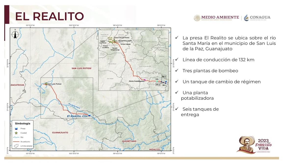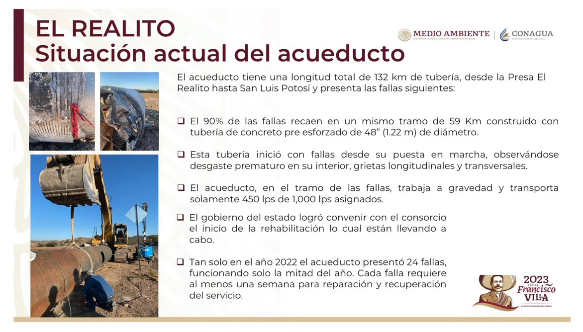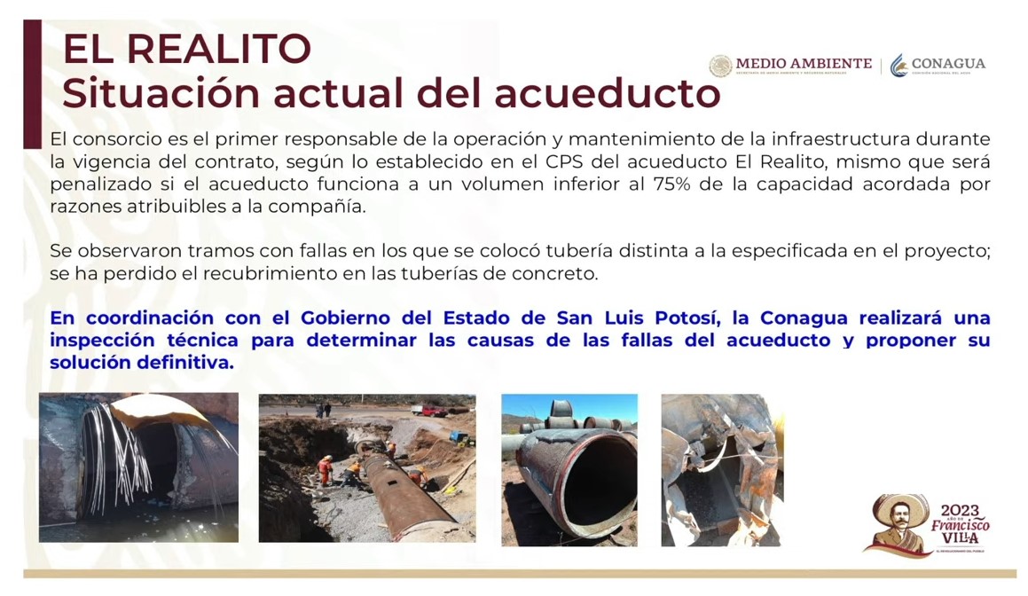 Respecto al acueducto El Realito, el director de la Conagua indicó que la dependencia a su cargo realizará una inspección técnica en coordinación con el gobierno de San Luis Potosí para determinar las causas de las fallas del acueducto y proponer su solución definitiva.