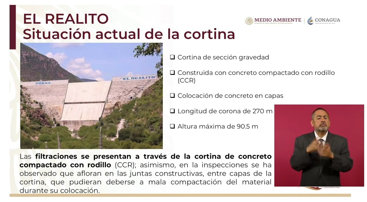 Asimismo, aseguró que la cortina de la presa “El Realito” presenta fugas y filtraciones entre las capas y juntas constructivas, y explicó que esto “no afecta nada la estabilidad ni la estructura de la presa”, pues “no presenta grietas estructurales”.