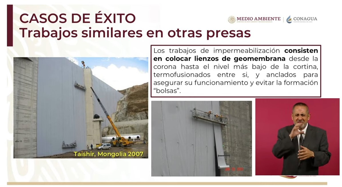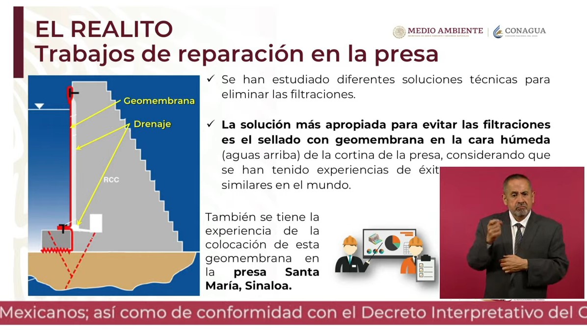 Señaló que la Conagua revisa continuamente la presa y ha detectado filtraciones derivadas del proceso constructivo que no significan riesgo para la población. Implementa un método de sellado con geomembrana en la cara húmeda, que también fue colocado con éxito en la Presa Santa María en Sinaloa.