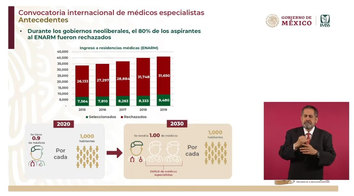El llamado se dirige a los especialistas en medicina del extranjero que estén interesados en venir a trabajar a México, a quienes se les brindará contratos anuales. “El mecanismo nos va a servir sobre todo para cubrir en aquellos lugares con más necesidad”.