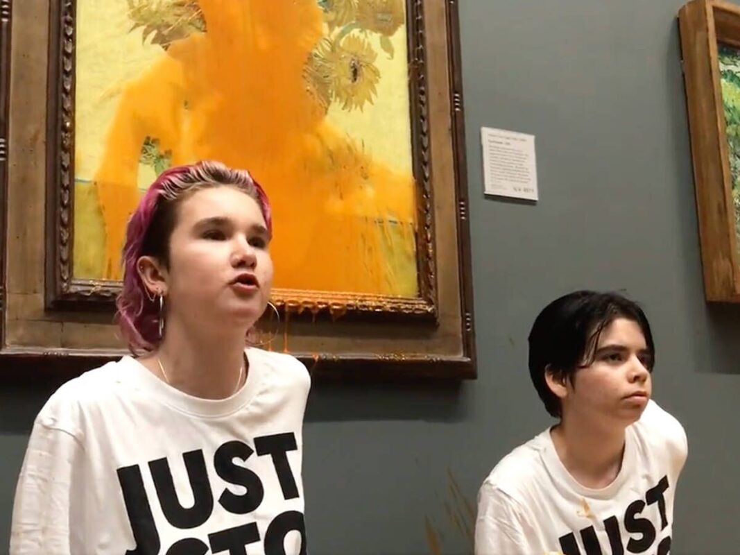 | Dos jóvenes de la organización ecologista «Just Stop Oil», lanzaron grandes botes de sopa de tomate contra la obra “Los Girasoles”, de Vicent van Gogh, en la National Gallery de Londres.