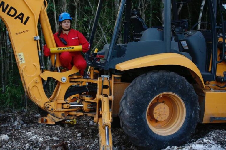 Activistas de la organización ambientalista Greenpeace inmovilizaron maquinaria que está deforestando selva para la construcción del tramo 5 del Tren Maya. En total, ocho activistas se ataron a las máquinas para demandar la suspensión inmediata del tramo 5, que va de Cancún a Tulum.