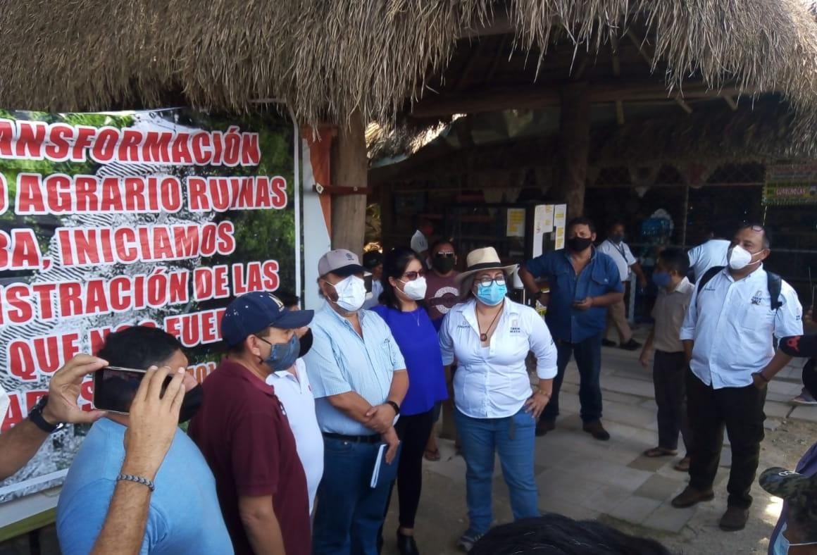 Lilia González Moreno, Enlace Territorial de Tren Maya en el Tramo 6, encabezó la representación la mesa de concertación con el Ejido de Cobá, donde también participaron representantes de la Segob y del INAH en Quintana Roo, así como una comisión de integrantes del Comisariado Ejidal de Cobá que preside Fausto May.