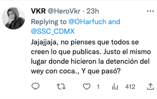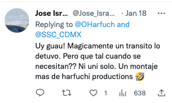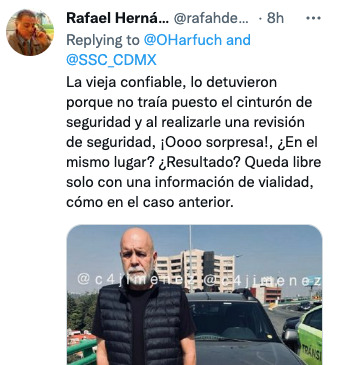 Por lo cual los comentarios cargados de sospechas y recriminaciones no se hicieron esperar y tundieron a Harfuch, “La vieja confiable, lo detuvieron porque no traía puesto el cinturón de seguridad y al realizarle una revisión de seguridad, ¡Oooo sorpresa!, ¿En el mismo lugar? ¿Resultado? Queda libre solo con una información de vialidad, cómo en el caso anterior?” señala un comentario.