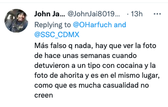 Uno mas señaló “Más falso q nada, hay que ver la foto de hace unas semanas cuando detuvieron a un tipo con cocaina y la foto de ahorita y es en el mismo lugar, como que es mucha casualidad no creen?”.