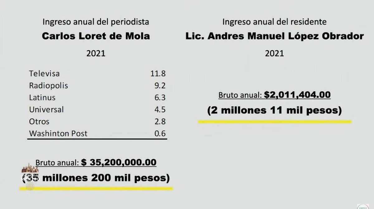 “Miren esto. ¿Lo sabía la gente? ¿Sabía el pueblo de México que este señor tiene ingresos como periodista por 35 millones de pesos al año? Dos millones de pesos al mes. ¿Quién gana eso? ¿Un científico, un intelectual, el Presidente? ¿Y por qué gana tanto ese señor? Porque le pagan los de la mafia del poder para atacarme, debilitarnos y que regrese el mismo régimen de corrupción”, aseguró desde Palacio Nacional.
