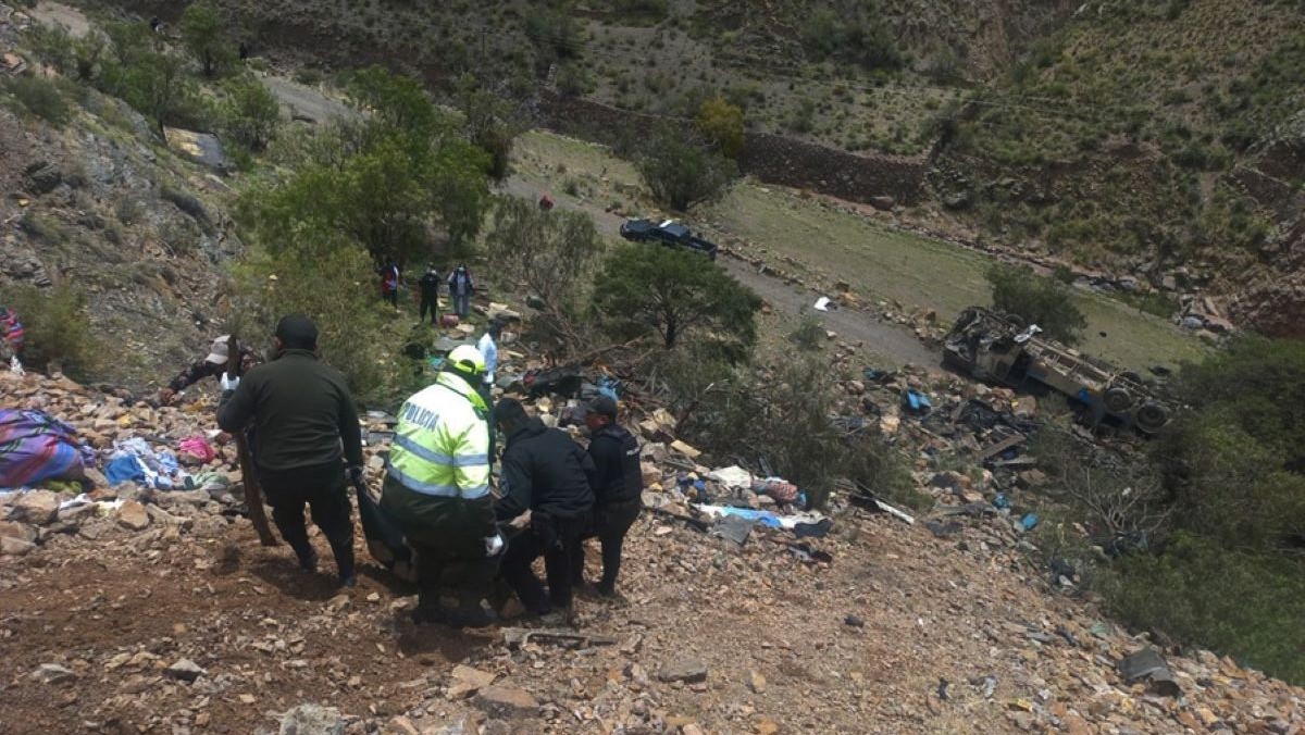 La tragedia ocurrió en una peligrosa carretera de montaña en el distrito suroeste de Yocalla, donde el autobús cayó casi 800 metros.