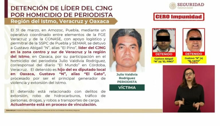 Gustavo Abigaíl “N”, conocido como “El Pino”, aseguró la funcionaria federal, está relacionado directamente en el homicidio del periodista Julio Valdivia Rodríguez, corresponsal del Diario El Mundo en Córdoba, en Veracruz.