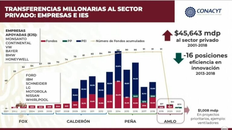 María Elena Álvarez-Buylla, directora del Consejo Nacional de Ciencia y Tecnología (Conacyt), dio a conocer esta mañana que los gobiernos de Vicente Fox Quesada, Felipe Calderón Hinojosa y Enrique Peña Nieto transfirieron más de 45 mil millones de pesos a empresas privadas, entre ellas transnacionales, supuestamente para “investigación”. Pero México cayó, dijo, 16 posiciones en eficiencia en innovación justo en ese periodo, entre 2013 y 2018.
