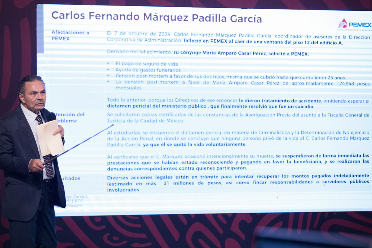 El director general de Pemex explicó que el 7 de octubre de 2004, Carlos Fernando Márquez –entonces coordinador de asesores de la Dirección de Administración de Pemex y esposo de María Amparo Casar– se suicidó en las instalaciones de la empresa (se arrojó desde una ventana del piso 12 del edificio A de la Torre de Pemex en la Ciudad de México). En aquel año, la petrolera estaba encabezada por Raúl Muñoz Leos.