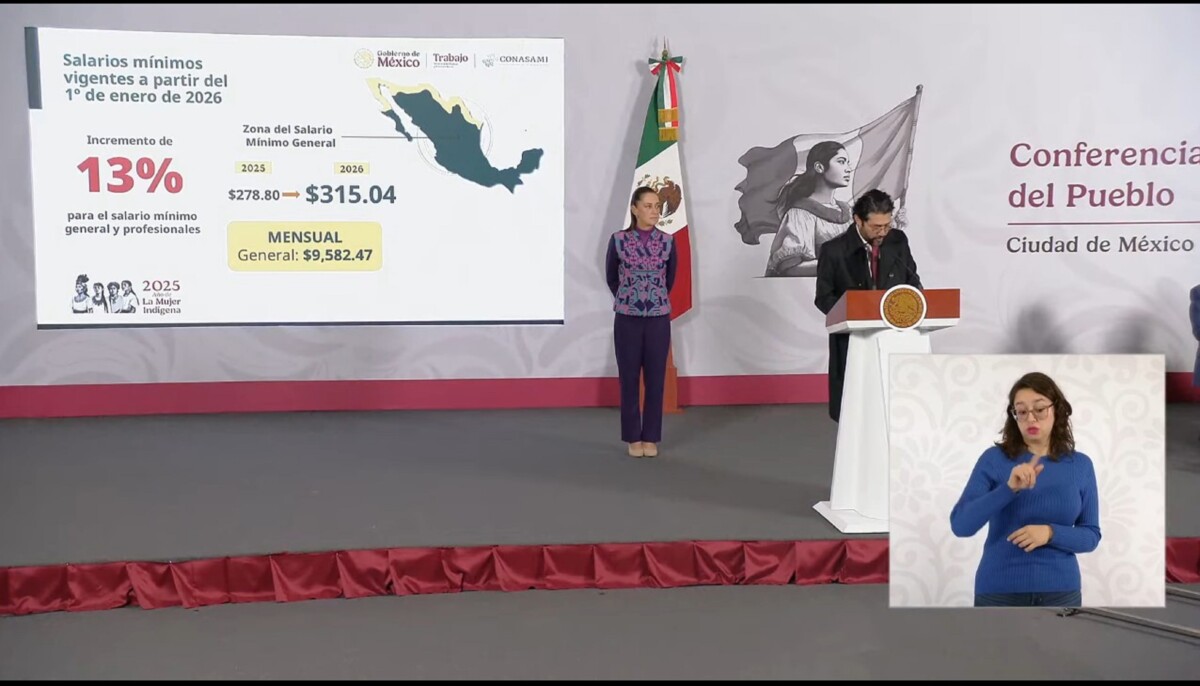 Hemos definido, asentó, los salarios mínimos que estarán vigentes a partir del próximo 1 de enero del año 2026: un incremento de 13 por ciento del salario mínimo general, con lo que pasará de 278.80 pesos a 315.04 pesos diarios en términos mensuales. “Esto representa 9 mil 582.47 pesos”.