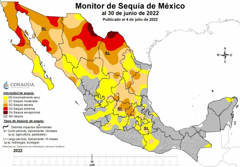El reporte indica que Aguascalientes, Baja California, Coahuila, Chihuahua, Querétaro y Sonora cuentan con al menos el 94 por ciento de sus municipios con sequía; siendo Coahuila y Chihuahua los únicos con municipios en sequía excepcional, es decir, D4.