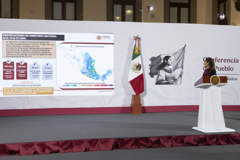 Durante la Mañanera del Pueblo, la coordinadora indicó que se presentaron precipitaciones en 31 entidades de la República, con una mayor presencia en Zihuatanejo, Guerrero, en donde cayeron hasta 151 mm de lluvia. Además, detalló que tras las afectaciones dos personas perdieron la vida, una por deslizamiento de ladera en Pinal de Amoles, Querétaro, y un policía en labores de rescate en Papantla, Veracruz.