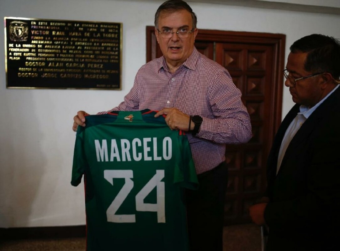 Al concluir el homenaje, Ebrard se vistió con una playera de la selección mexicana de futbol, con el nombre en la espalda de “Marcelo 24”.