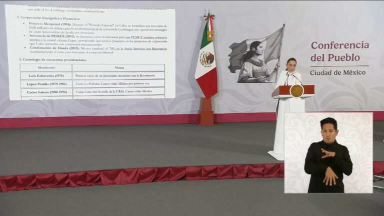 Asimismo, la presidenta presentó una cronología de encuentros presidenciales entre México y Cuba desde la primera visita oficial tras el triunfo de la Revolución cubana, y precisó que, por el momento, no tiene previsto realizar una visita a la isla.