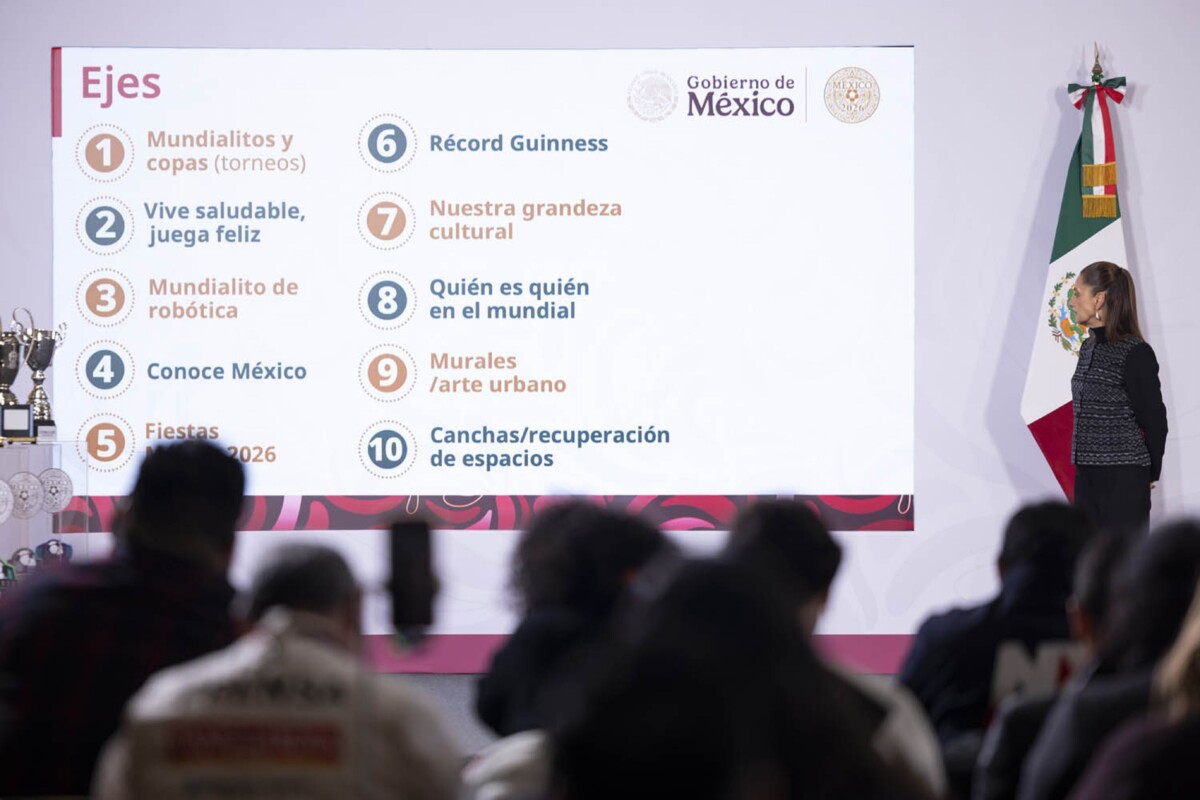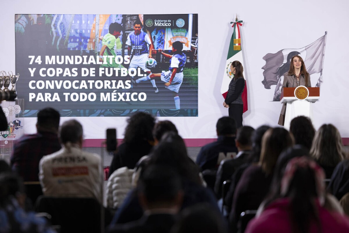 “74 Mundialitos y Copas durante todo el 2026. Y las inscripciones para todas y todos en Conade, en la SEP, en la Secretaría de las Mujeres, en el IMSS, en Instituto de la Juventud y en Secihti”, destacó en la conferencia matutina “Las mañaneras del pueblo”.