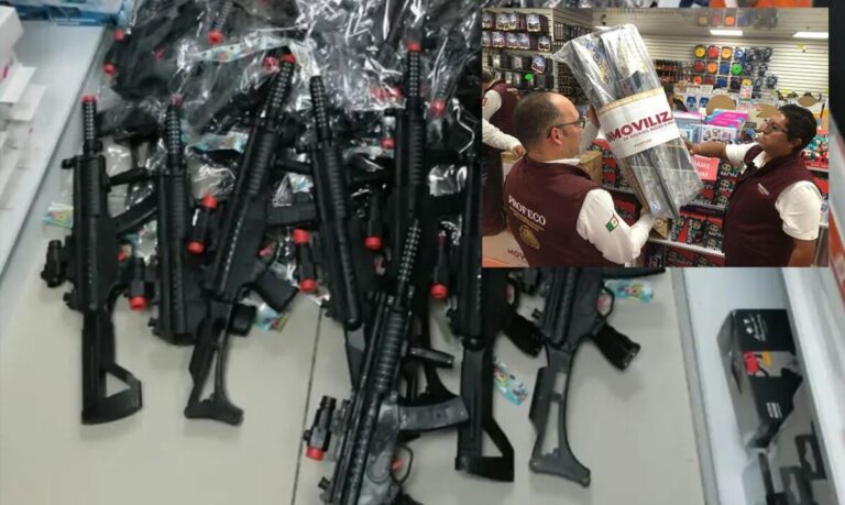 Con un aparatoso operativo realizado en la Plaza Comercial Izazaga 89, ubicada en la colonia Centro de la Ciudad de México (CDMX), personal de la Procuraduría Federal del Consumidor (Profeco) inmovilizó un enorme arsenal de armas de juguete.