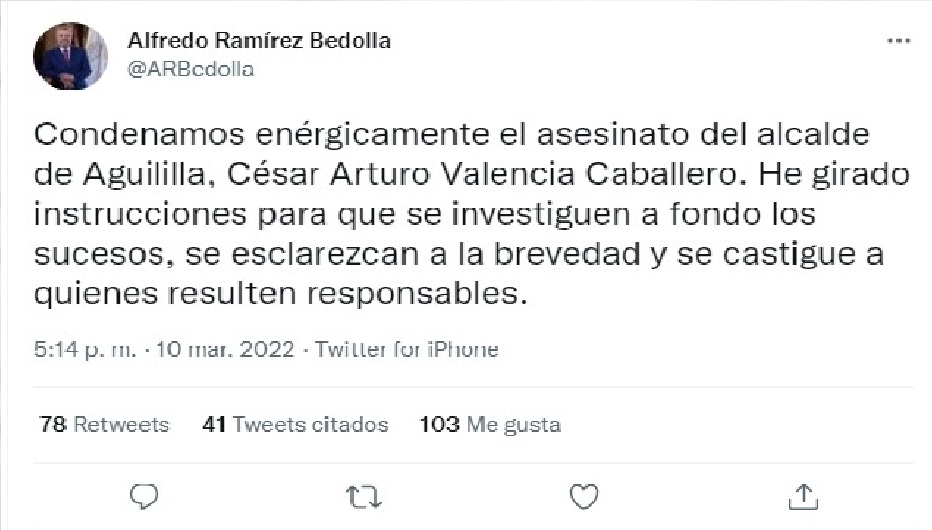 “Condenamos enérgicamente el asesinato del alcalde de Aguililla, César Arturo Valencia Caballero. He girado instrucciones para que se investiguen a fondo los sucesos, se esclarezcan a la brevedad y se castigue a quienes resulten responsables”, dijo.