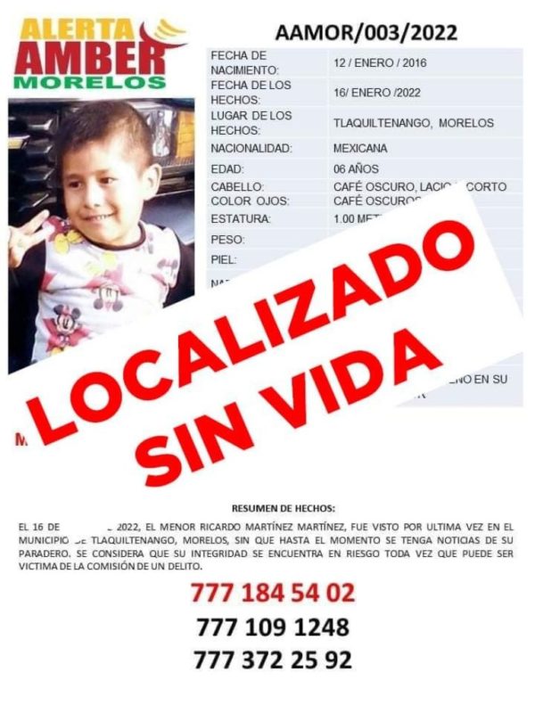El niño de nombre Ricardo de seis años fue reportado como desaparecido en el municipio Tlaquiltenango, municipio ubicado en la zona sur de Morelos; hoy fue encontrado sin vida.