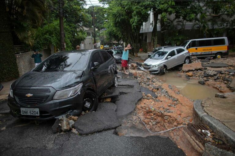 En las calles de Petrópolis, muchos vecinos describían un “escenario de guerra”, con viviendas reducidas a escombros en laderas arrasadas y vehículos apilados en calles de agua y barro.