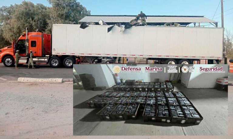 Elementos de las fuerzas federales incautaron mas de 1200 paquetes con cocaína ocultos en un traíler durante un operativo de seguridad en un punto de revisión ubicado en San Luis Río Colorado, Sonora.