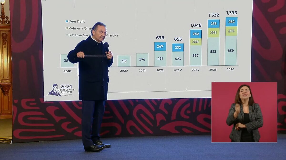 Destacó que el procesamiento y refinación de hidrocarburos ha aumentado a más del doble de lo que se registraba al inicio del sexenio, al pasar de 519 mil barriles en noviembre de 2018 a mil 764 en 2023, contando la producción de la refinería de Deer Park, Texas. Añadió que la meta es que en 2026 se procesen y refinen 1 millón 774 mil barriles, con la aportación de la refinería de Dos Bocas y de las coquizadoras que están en construcción.