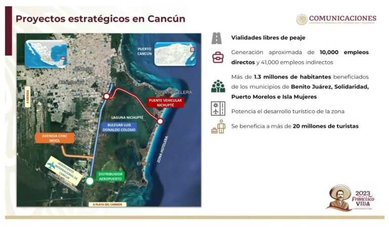 Sobre el Programa Integral para Desarrollo de Proyectos Estratégicos en Cancún, el funcionario puntualizó que están en ejecución carreteras como la Avenida Chac Mool y el Puente Vehicular Nichupté; simultáneamente, el Bulevar Luis Donaldo Colosio y el Distribuidor en Cancún están en proceso de modernización como parte de la construcción del tramo 4 del Tren Maya.