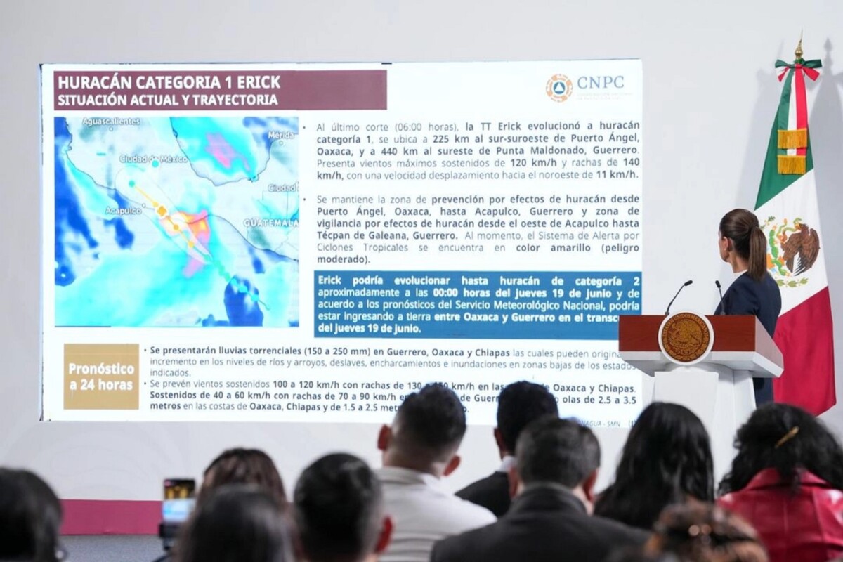 El impacto del huracán categoría 1 Erick —que se espera que toque tierra en las primeras horas de este jueves— podría darse en la región que va de Puerto Escondido, Oaxaca, hasta Acapulco, Guerrero, se informó esta mañana en la conferencia de la presidenta Claudia Sheinbaum Pardo.