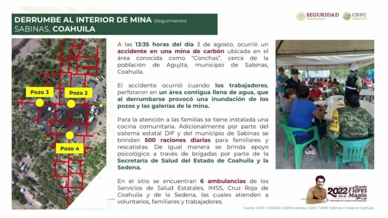 Asimismo, dijo, se ha brindado atención psicológica y otros apoyos a los familiares de los mineros que se encuentran en la zona, donde hay una cocina comunitaria que ofrece 500 raciones diarias de comida caliente, con respaldo del sistema estatal DIF y del municipio de Sabinas.