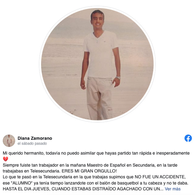 En sus redes sociales, la mujer publicó “Lo que te pasó en la Telesecundaria en la que trabajas supimos que no fue un accidente, ese ‘alumno’ ya tenía tiempo lanzándote con el balón de basquetbol a tu cabeza y no te daba. Hasta el día jueves (de la semana pasa), fue que te dio en la cabeza en la sien ocasionando tu muerte”.