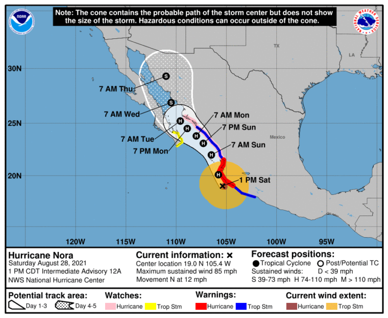 De acuerdo con la previsión del Centro Nacional de Huracanes de Estados Unidos, Nora se acercará a la bahía que protege Puerto Vallarta el domingo en la mañana y luego avanzará directamente hacia el estrecho Golfo de California un día más tarde, pasando muy cerca de los balnearios turísticos de Los Cabos. El de Mazatlán también quedará cerca de su trayectoria.