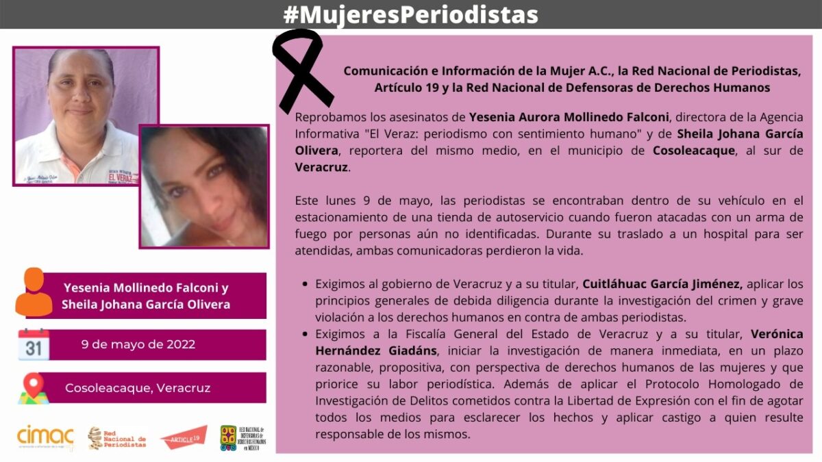 La Comisión Estatal para la Atención y Protección de los Periodistas informó que las periodistas asesinadas eran además colaboradoras de la agencia Veraz, medio digital del sur de Veracruz. Mollinedo incluso era la directora.