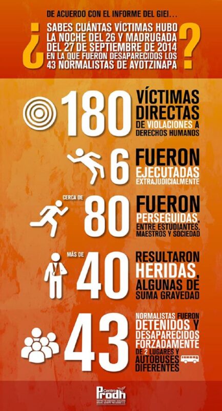 De ese escenario, policías de Iguala, apoyados por el grupo criminal Guerreros Unidos, se llevaron a una parte de los 43 estudiantes desaparecidos aquella noche. Los muchachos habían llegado a Iguala por la tarde, con la intención de tomar unos autobuses y llevárselos a su escuela. Salieron de la terminal en cinco autobuses, tres en dirección norte, hacia Juan N. Álvarez y dos hacia el sur. En Juan N. Álvarez, policías de Iguala se llevaron a los muchachos del autobús que cerraba la comitiva, después de perseguirles y dispararles. Eran alrededor de 20.