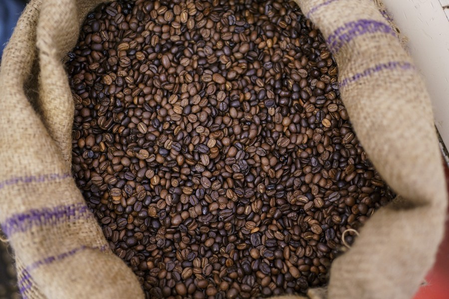 Personas beben café en una banca frente al Café Equis en el marco del Día Internacional del Café, en la Ciudad de México, el 1 de octubre de 2021. (Xinhua/Luis Licona)