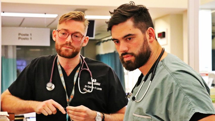 Fue canalizado a una clínica a una hora de Montreal para sustituir a los enfermeros que han sido contagiados. Laurent Duvernay-Tardif porta en su uniforme el logo de Kanas, con quienes espera volver pronto.​