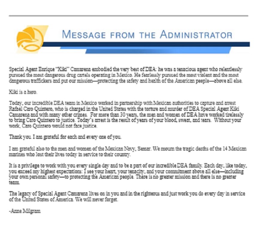 “Hoy, nuestro increíble equipo de la DEA en México trabajó en conjunto con las autoridades mexicanas para capturar y arrestar a Rafael Caro Quintero, quien está acusado en EU de torturar y asesinar al agente especial de la DEA ‘Kiki’ Camarena”, destacó la jefa de la Agencia Antidrogas estadounidense, Anne Milgram en un mensaje enviado a sus empleados y publicado en su sitio oficial de Internet.