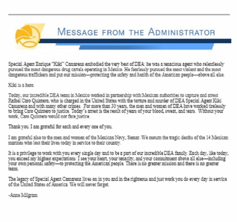 “Hoy, nuestro increíble equipo de la DEA en México trabajó en conjunto con las autoridades mexicanas para capturar y arrestar a Rafael Caro Quintero, quien está acusado en EU de torturar y asesinar al agente especial de la DEA ‘Kiki’ Camarena”, destacó la jefa de la Agencia Antidrogas estadounidense, Anne Milgram en un mensaje enviado a sus empleados y publicado en su sitio oficial de Internet.
