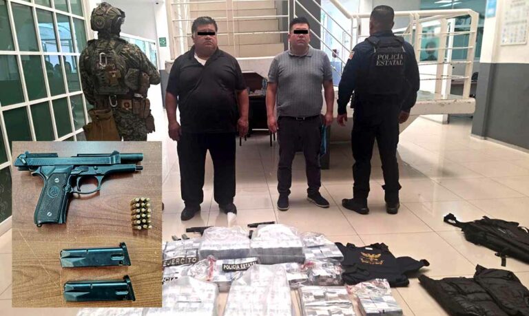 Durante la revisión, las autoridades localizaron dos armas de fuego cortas, cuatro cargadores y cartuchos útiles, así como una cantidad considerable de dinero en efectivo que ascendía a 37 millones de pesos, sin que los detenidos pudieran acreditar su legal procedencia ni presentar la documentación correspondiente.