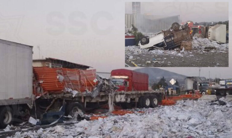 Uno de ellos que iba acoplado a dos cajas secas y el otro a una plataforma, además, también resultó afectada una camioneta tipo pick up que quedó entre las unidades de carga.
