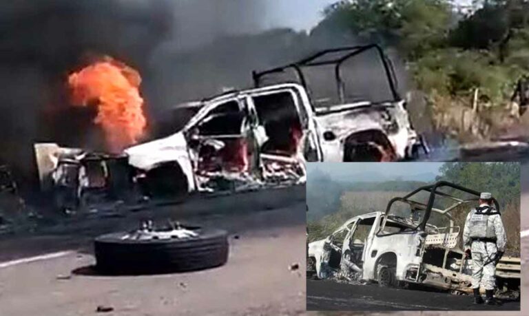 El impacto entre las unidades generó un incendio de gran magnitud que consumió por completo al menos dos de los vehículos involucrados, uno de ellos la camioneta de la Guardia Nacional.