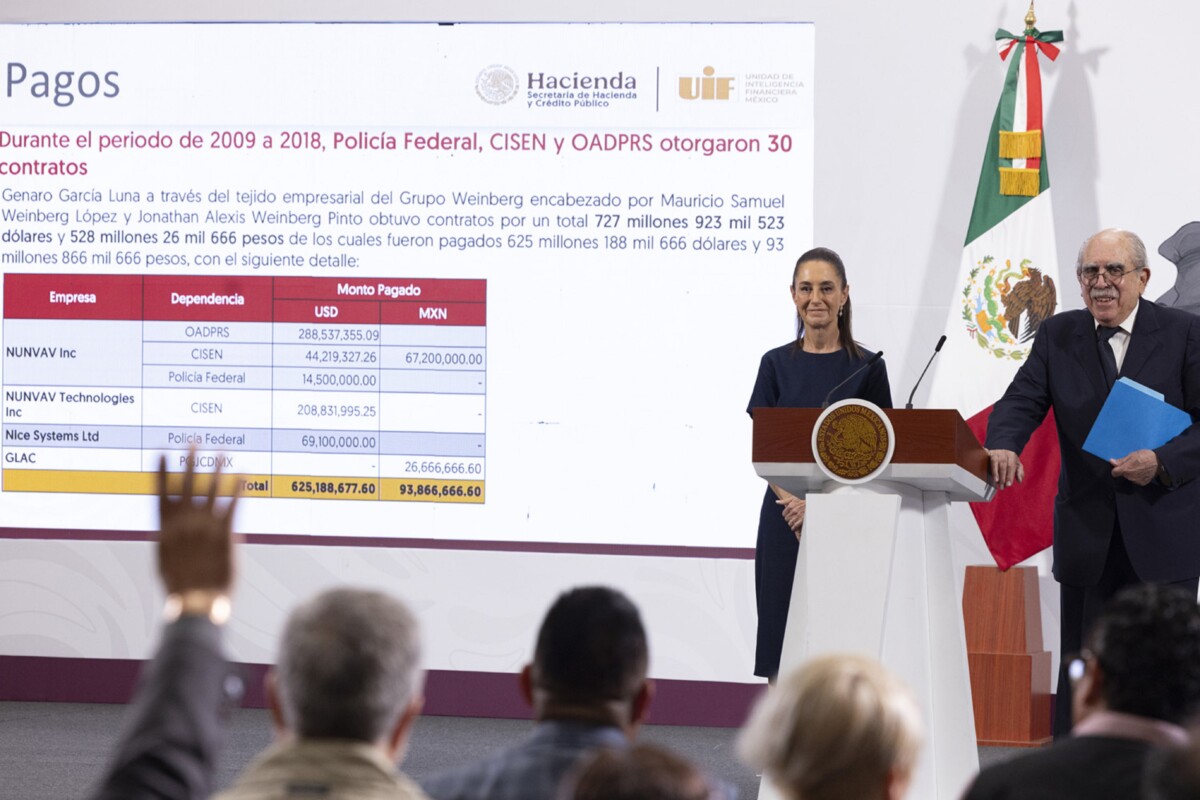García Luna, a través del tejido empresarial del Grupo Weinberg, encabezado por Mauricio Samuel Weinberg López y Jonathan Alexis Weinberg Pinto, obtuvo contratos por un total de 727 millones 923 mil 523 dólares y por 528 millones 26 mil 666 pesos, de los cuales fueron pagados 625 millones 188 mil 666 dólares y 93 millones 866 mil 666 pesos.