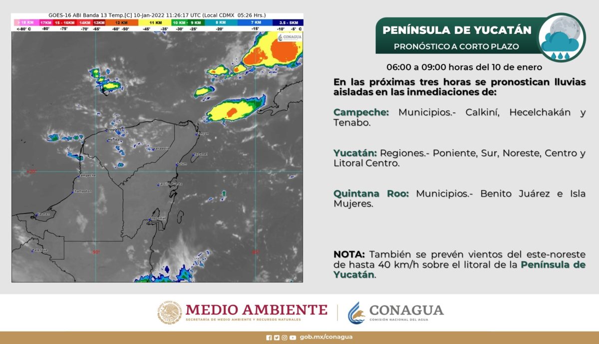 Península de Yucatán: Cielo medio nublado con temperaturas templadas por la mañana. Nublado por la tarde con lluvias puntuales fuertes en Campeche y Quintana Roo, además de chubascos en Yucatán. Ambiente cálido a caluroso durante el día. Viento de componente norte de 15 a 30 km/h en la región y rachas de 50 a 60 km/h en las costas de Campeche y Yucatán.