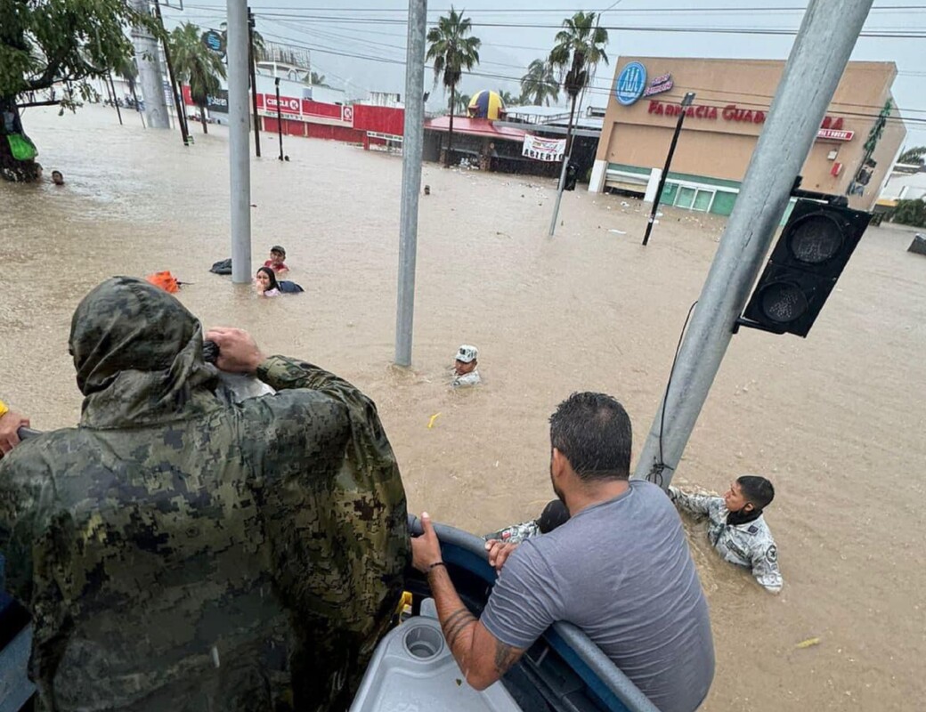 Acapulco se desquició por inundaciones de hasta metro y medio de altura provocadas por las lluvias, que convirtieron en ríos calles de decenas de colonias, entre ellas 31 de la zona Diamante, donde cuerpos de auxilio rescataban con dificultad a personas atrapadas; el transporte se paralizó y en varios puntos se formaron largas filas de ciudadanos que intentaban adquirir productos básicos en las pocas tiendas abiertas; algunas sufrieron actos de rapiña.