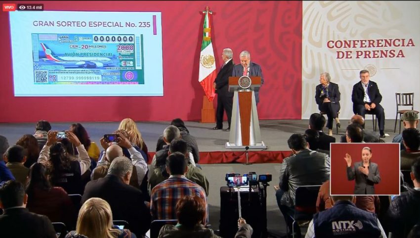 El presidente Andrés Manuel López Obrador y el director de la Lotería Nacional, Ernesto Prieto Ortega, anunciaron la primera etapa de venta de boletos para el sorteo del equivalente al valor del avión presidencial, la cual contempla 64 ciudades del país en 29 estados de la República.