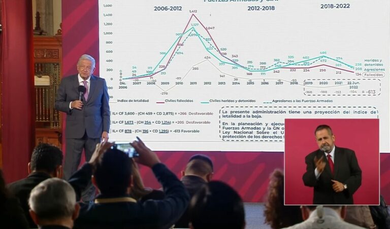 Explica el Presidente López Obrador la gráfica de letalidad durante la etapa de Felipe Calderón, ante la insistencia de un reportero que decía que durante el gobierno de AMLO hay más muertos que en el Felipe Calderón, luego de la explicación el periodista no dijo más sobre ese asunto, se quedó sin “argumentos”.