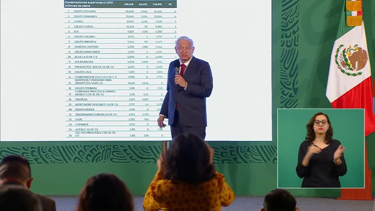 El mandatario, quien desde hace décadas ha denunciado los privilegios del sistema bancario, retomó la información que también está contenida en su más reciente libro, A la mitad del camino, en torno al valor de las condonaciones a grandes empresas en las dos administraciones anteriores, que sumaron 366 mil 174 millones de pesos. Con Calderón se les otorgó un perdón fiscal por 121 mil 891 millones, y con Peña Nieto fue poco más del doble de esa cifra, con 244 mil 283 millones de pesos.