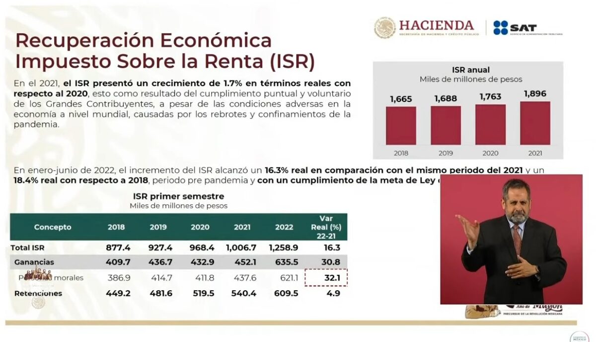 “En enero-junio de 2022, la recaudación ascendió a dos billones 049 mil millones de pesos, lo que implica un crecimiento de 2.7 por ciento respecto del año anterior y 8.6 por ciento respecto de 2018”, dijo.